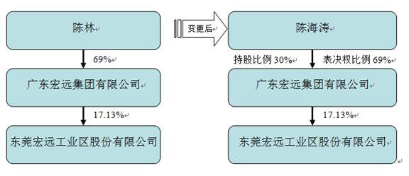 东莞宏远工业区股份有限公司(以下简称“公司”、“本公司”)于2018年6月19日收到公司控股股东广东宏远集团有限公司(以下简称“宏远集团”)的通知函,由于公司原实际控制人陈林先生于2018年1月9日因病逝世(相关讣告公告披露于2018年1月10日巨潮资讯网),宏远集团于近期办理了其股东变更等相关手续,其控股股东及实际控制人已由原来的陈林先生变更为陈海涛先生。基于此,本公司的实际控制人亦将变更为陈海涛先生,具体情况如下: